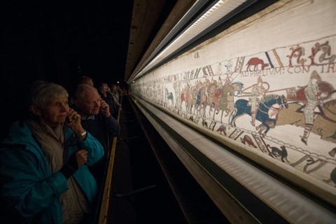 | Des visiteurs admirent la tapisserie de Bayeux, exposée dans cette ville du Calvados. |