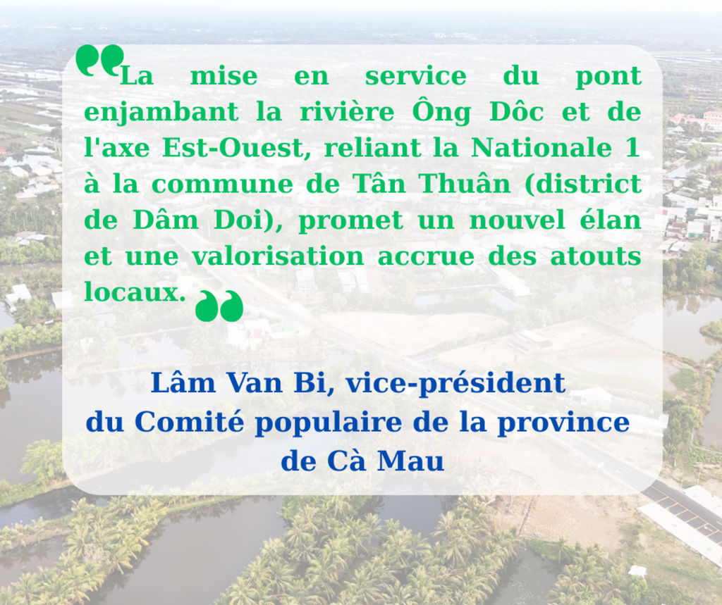 L'investissement dans les infrastructures de transport clés a créé une connexion entre les zones intérieures, les zones économiques côtières et les parcs industriels. Cette vision stratégique ne sert pas seulement le développement socio-économique, mais vise également à assurer la sécurité et la défense nationales. Les habitants sont d'autant plus enthousiastes que la construction de l'autoroute reliant la ville de Cà Mau à Dât Mui est prévue entre 2026 et 2030.