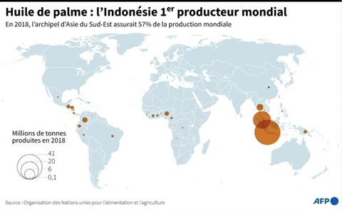 | Carte représentant les principaux pays producteurs d'huile de palme en 2018, selon l'Organisation des nations unies pour l'alimentation et l'agriculture. |