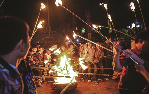 Au moment du passage à la Nouvelle Année, le maître de cérémonie tire avec un air solennel le feu de l’autel du Saint, puis allume la chaudière d’huile dans la cour de la maison commune. La lumière du feu sacré éclaire alors un coin du ciel. La cérémonie de demande du feu des saints commence au son des gongs et des tambours et l’excitation de la fête.