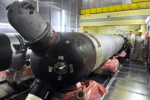 | Un échangeur de chaleur lors de son retrait de l'ancienne centrale nucléaire de Brennilis dans le centre du Finistère, le 25 novembre 2014. |