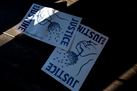 | Pancarte où l'on peut lire "Justice pour Justine" pendant une manifestation en mémoire de Justine Damond, le 20 juillet à Minneapolis dans le Minnesota. |