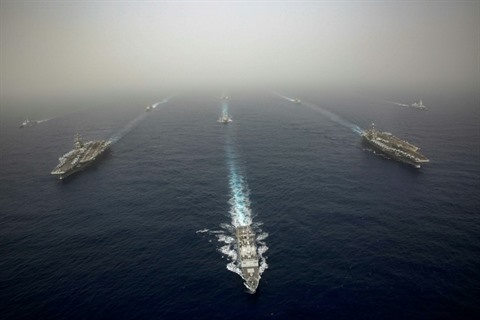 | Photo fournie par l'US Navy le 24 avril montrant le porte-avions "USS Abraham Lincoln" et son escorte. |