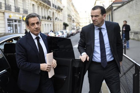 | Le président de l'UMP, Nicolas Sarkozy (gauche), à son arrivée au siège de l'UDI, le 23 mars à Paris. |