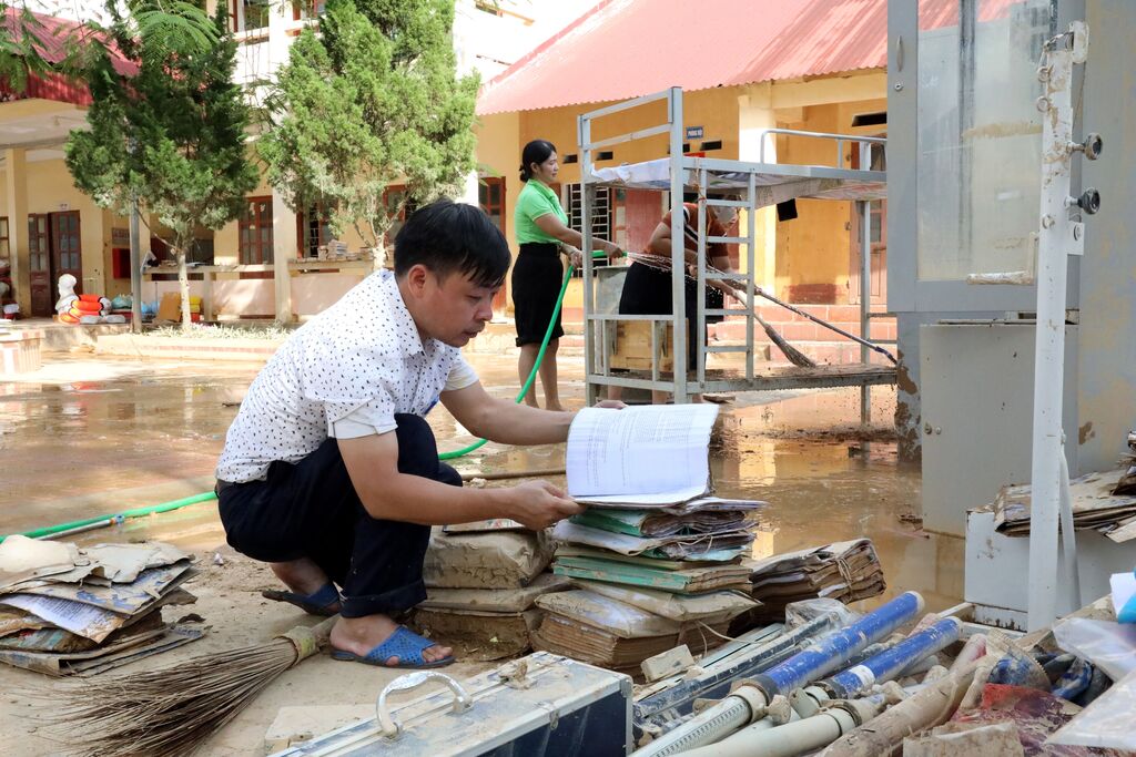 | Hoàng Huu Duong, directeur de l'École secondaire de Yên Binh (Lang Son), passe en revue les fournitures et les documents pédagogiques, s'efforçant de récupérer et d'utiliser tout ce qui est encore utilisable. |