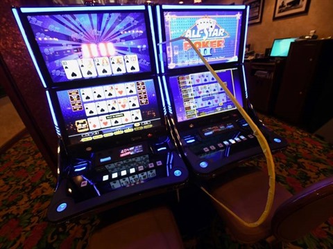 | Une paroi en plexiglas entre deux machines à sous dans un casino de Las Vegas, le 29 avril au Nevada. |