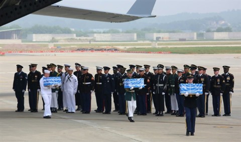 | Les restes de soldats américains tués lors de la guerre de Corée sont transférés sur la base aérienne d'Osan le 27 juillet 2018. |