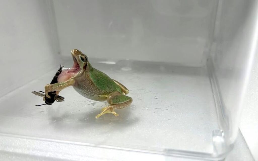 L'une des vidéos des attaques montre une grenouille malchanceuse tentant en vain de mastiquer l'insecte, avant de s'aider de sa patte avant pour recracher vigoureusement sa proie. Au total, plus d'un tiers des prédatrices finissaient par recracher les mâles après avoir été piquées. L'expérience a été reproduite avec des guêpes dont on avait retiré les parties génitales: les grenouilles n'en ont fait qu'une bouchée.