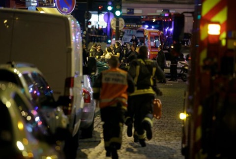 | Les secours se précipitent vers le Bataclan, le 13 novembre 2015 à Paris. |