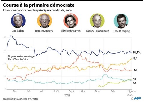 Au niveau national, c'est Joe Biden qui arrive en tête dans les sondages, devant Bernie Sanders et Elizabeth Warren. Le milliardaire Michael Bloomberg, quatrième, ne concourt pas dans l'Iowa, faisant l'impasse sur les premières primaires jusqu'au "Super Tuesday" du 3 mars, lorsqu'une quinzaine d'États voteront.