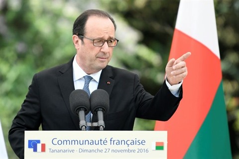 | François Hollande lors d'un discours devant la communauté française, le 27 novembre 2016 à Antananarivo, capitale de Madagascar. |