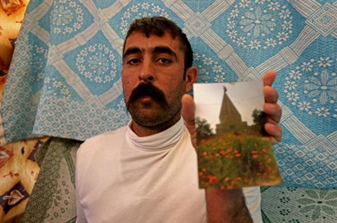 | Un réfugié yézidi montre une photo d'un monument religieux traditionnel de la communauté, le 17 novembre 2016, à Dohouk, en Irak. |