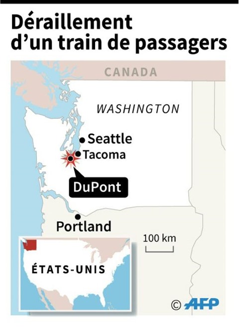 Le train 501, qui assurait la liaison entre Seattle et Portland, a déraillé vers 07h40 locales (15h40 GMT) en passant sur un pont ferroviaire surplombant l'autoroute I5, au nord d'Olympia, la capitale de l'État de Washington.