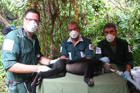 | M. Adler et deux vétérinaires australiens examinant un des deux Langurs capturés. |