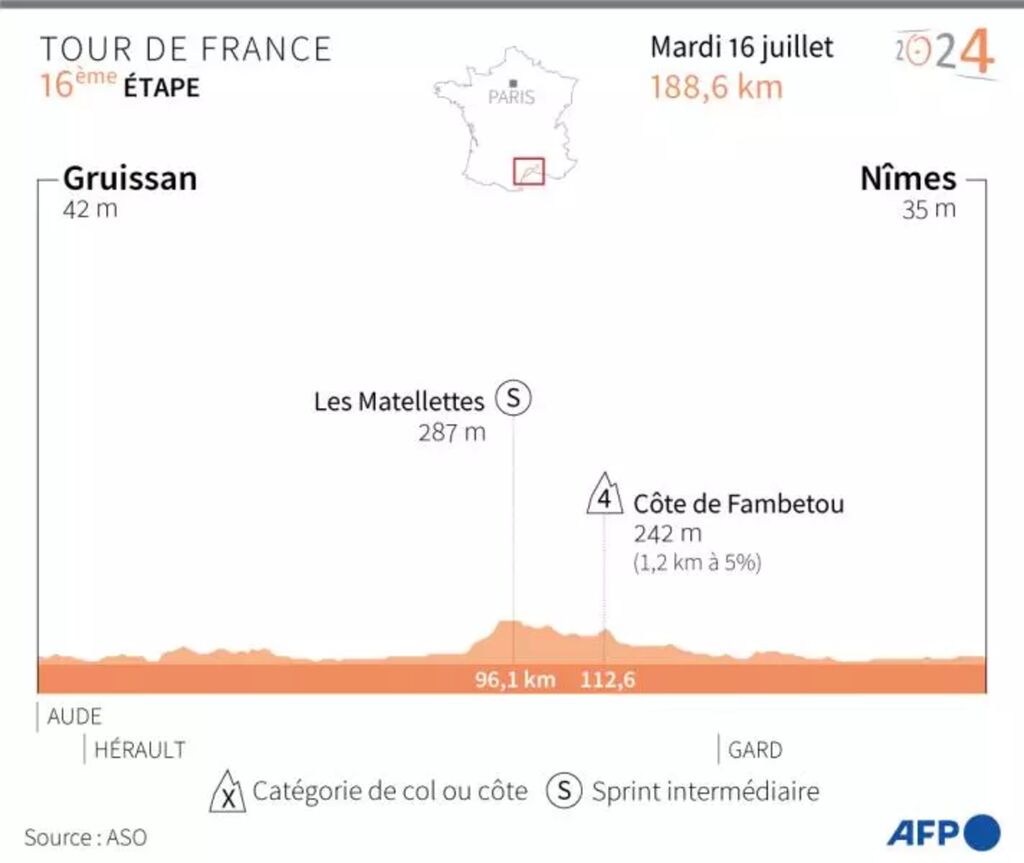 | Présentation du profil de l'étape 16 du Tour de France le 16 juillet entre Gruissan et Nîmes. |