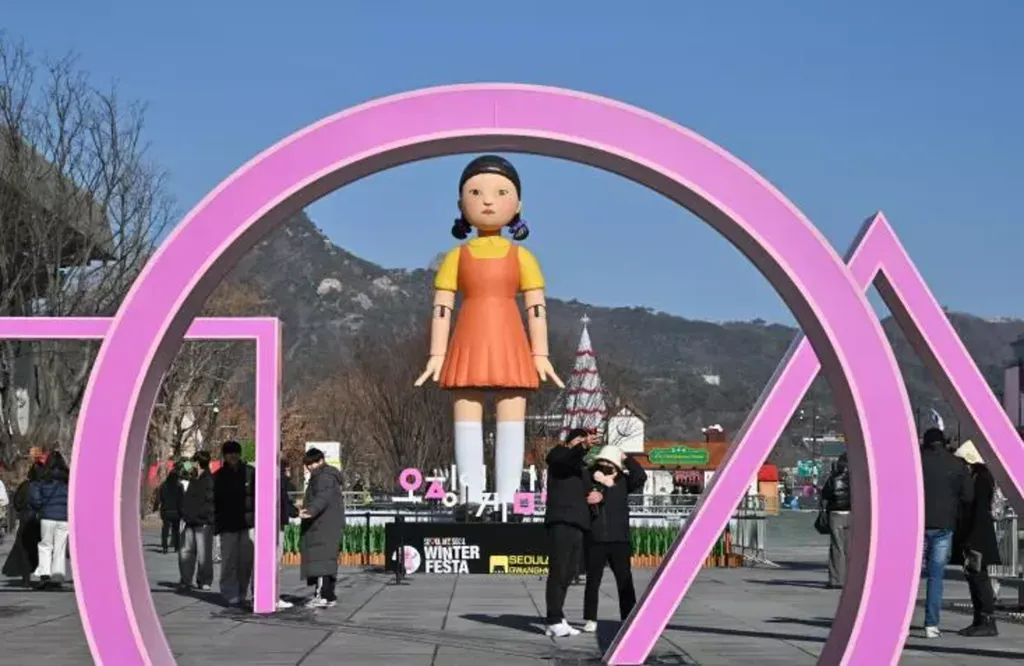 | Des visiteurs à Séoul devant la poupée Young-hee pour la promotion de la deuxième saison de la série Netflix Squid Game, le 26 décembre 2024. |