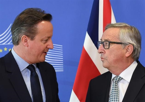 | Le Premier ministre britannique David Cameron (gauche) et le président de la Commission européenne Jean-Claude Juncker, le 16 février à Bruxelles. |