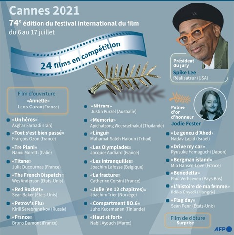 | La liste des 24 films en compétition officielle au 74e Festival de Cannes du 6 au 17 juillet. |
