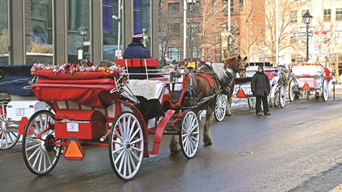 Au cœur du Vieux-Montréal, les sabots des chevaux martèlent le pavé au pied de la basilique Notre-Dame, l’une des attractions touristiques de la métropole québécoise. Décorées de rubans rouges et de branches de sapins, les calèches garées en file indienne sont photographiées par les touristes, tentés par une balade hivernale sous les couvertures.