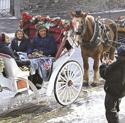 | Un cocher prend en photo des touristes avant une balade en calèche dans les rues du Vieux-Montréal. |