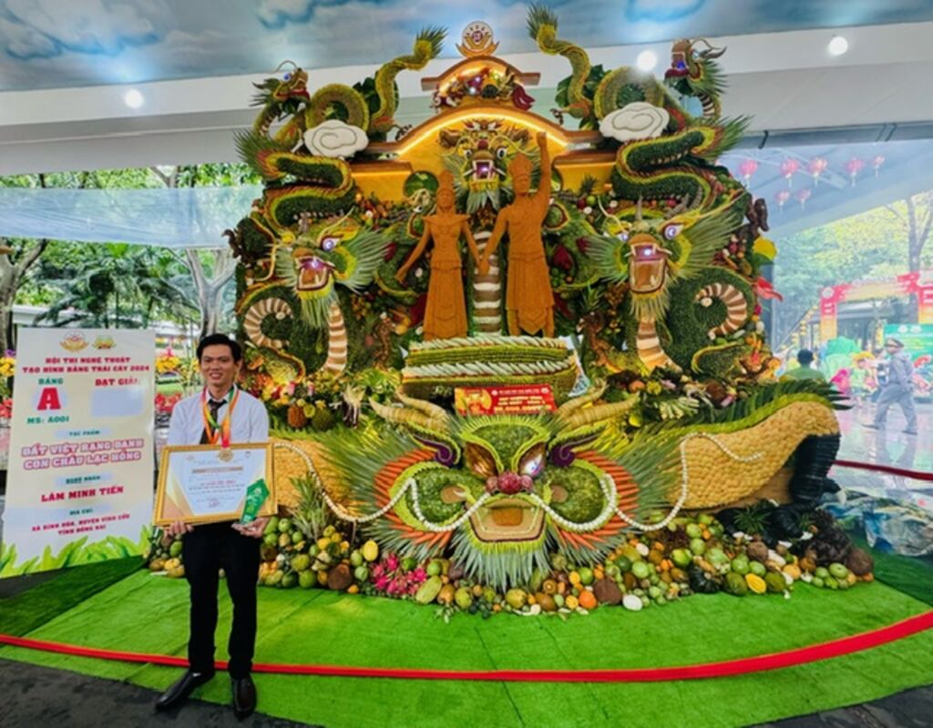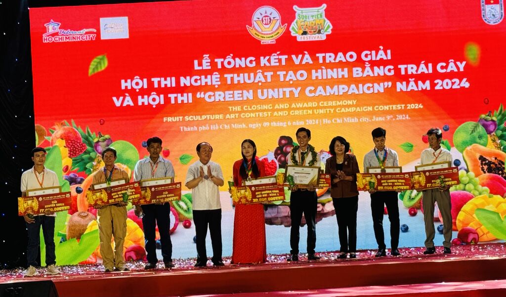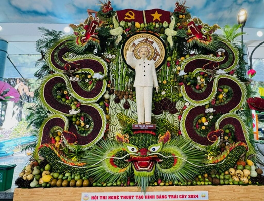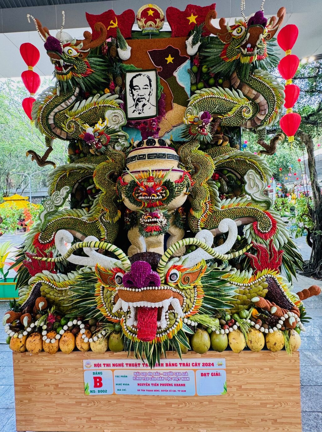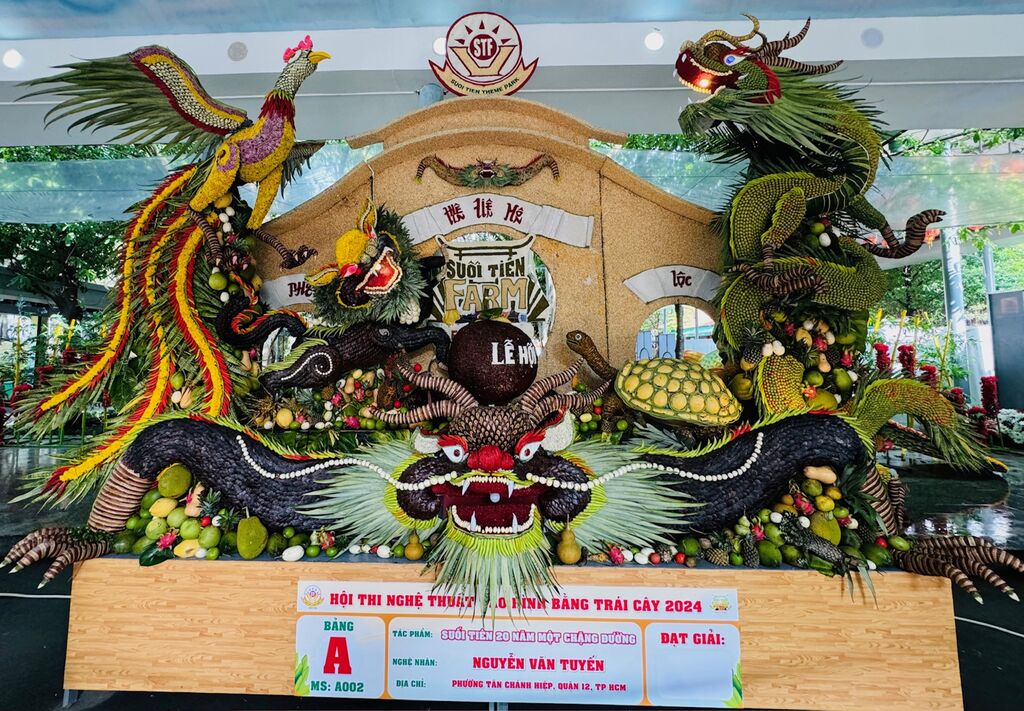 Cette année, le comité d'organisation a sélectionné les meilleures œuvres à récompenser par des prix. Dans le groupe A des œuvres de 4,0 m à 5,0 m x 1,2 m à 1,4 m x 3,5 m à 4,5 m, l'artisan Lâm Minh Tiên (Dông Nai) a remporté la médaille d'or et le prix de l’œuvre au plus nombreux type de fruits nommé. Trân Thi Bac (Long An) a quant à elle remporté une médaille d'argent (deuxième prix) avec son œuvre “Président Hô Chi Minh - un nom honoré pour toujours”. Le troisième prix est revenu à Nguyên Pham Tinh pour son oeuvre "Suôi Tiên - honneur de la ville nommée d'après Oncle Hô".