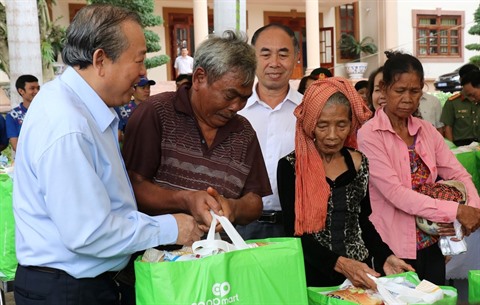 | Le vice-Premier ministre Truong Hoà Binh (gauche) remet des cadeaux à des familles pauvres d'ethnies minoritaires du district de Lôc Ninh. |