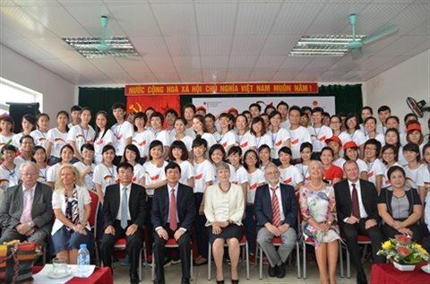 | Mme l’ambassadeur d’Allemagne au Vietnam, Jutta Frasch (1er plan, au milieu) et les futurs aides-soignants, en septembre 2014 à Hanoi. |
