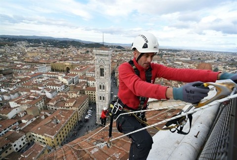 | Un alpiniste sur la coupole Brunelleschi de la cathédrale de Florence, en Italie, le 14 novembre. |