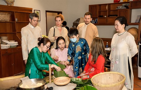 | Des amis étrangers sont invités à participer à des activités reconstituant le Têt traditionnel vietnamien, telles que l'emballage du "bánh chung". |