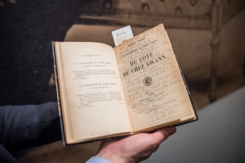 Une édition originale de Du côté de chez Swann est estimée entre 20.000 et 30.000 euros et, véritable trésor pour les "proustiens", un "placard" (jeu d'épreuves) encore inconnu de À l'ombre des jeunes filles en fleurs, en grande partie manuscrit, raturé et corrigé, est estimé entre 20.000 et 25.000 euros.