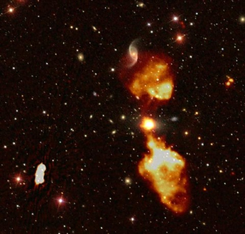 | Image recueillie par le radiotélescope LOFAR montrant une galaxie et son trou noir supermassif éjectant des particules par l'Observatoire de Paris-PSL. |