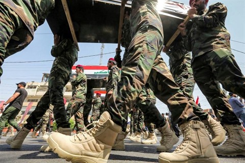 | Des membres du Hachd al-Chaabi, rendent hommage aux victimes de raids aériens américains, le 29 juin à Bagdad. |
