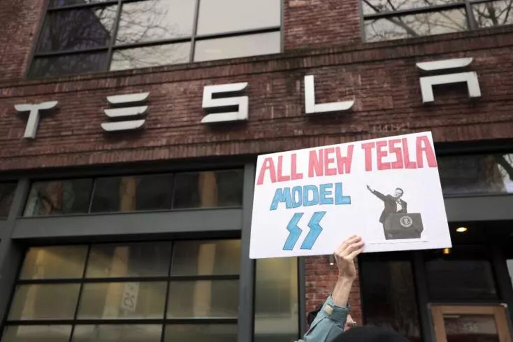 | Manifestation contre Elon Musk devant une boutique Tesla à Seattle, aux États-Unis, le 15 février. |