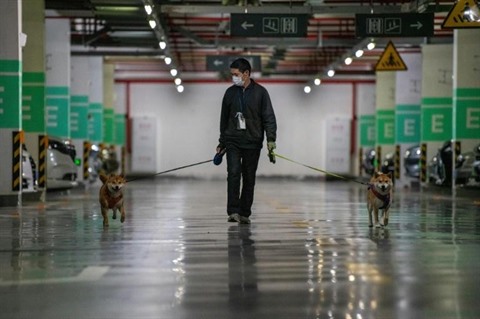 | Un habitant masqué de Shanghai promène des chiens dans un parking du district de Pudong, pendant le confinement, le 13 avril. |