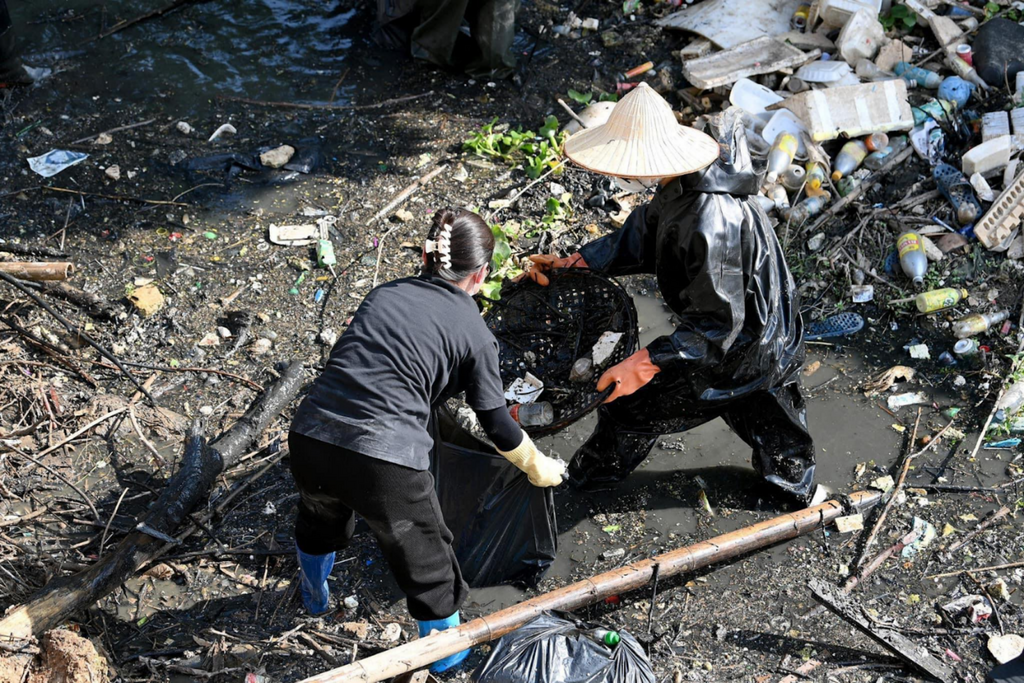 | Volontaires de Hà Nôi Xanh ramassant des déchets dans un cours d’eau de Hanoï. |