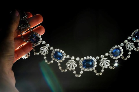 | Un collier en diamant et saphirs datant de 1800 et ayant appartenu à la fille adoptive de Napoléon, Stéphanie de Beauharnais, présenté chez Sotheby's à Genève le 5 mai. |
