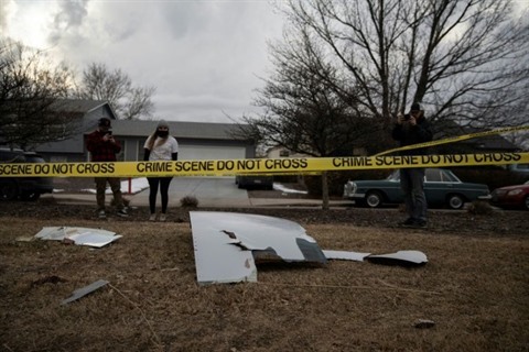 | Des habitants prennent en photo les débris d'un Boeing 777 tombés sur la banlieue résidentielle de Broomfield, près de Denver, le 20 février dans le Colorado. |
