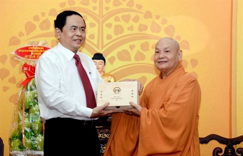 | Le président du Comité central du Front de la Patrie du Vietnam, Trân Thanh Mân (gauche), rend visite le 2 janvier au bronze Thich Thiên Nhon, président du conseil d’administration de l’Église bouddhique du Vietnam. |