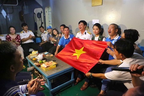 | Échange musical entre marins et journalistes sur le bateau Truong Sa 9. |