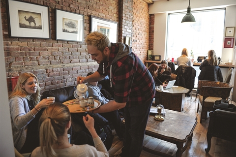 | David Chevrier, jeune gérant de l’Anti Café, sert le thé aux clients dans un café à Montréal, au Canada. |