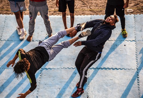 | Deux membres de la Fédération égyptienne de catch (EWR) s’entraînent à Ismaïlia en Égypte, le 28 juin. |