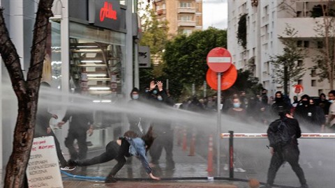 | La police utilise des canons à eau pour disperser des manifestants, le 13 février 2021 à Nicosie, à Chypre. |