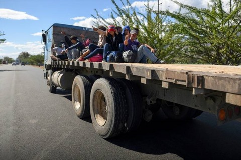 | Des migrants honduriens à bord d'un camion, à Zacapa (Guatemala), le 17 janvier. |
