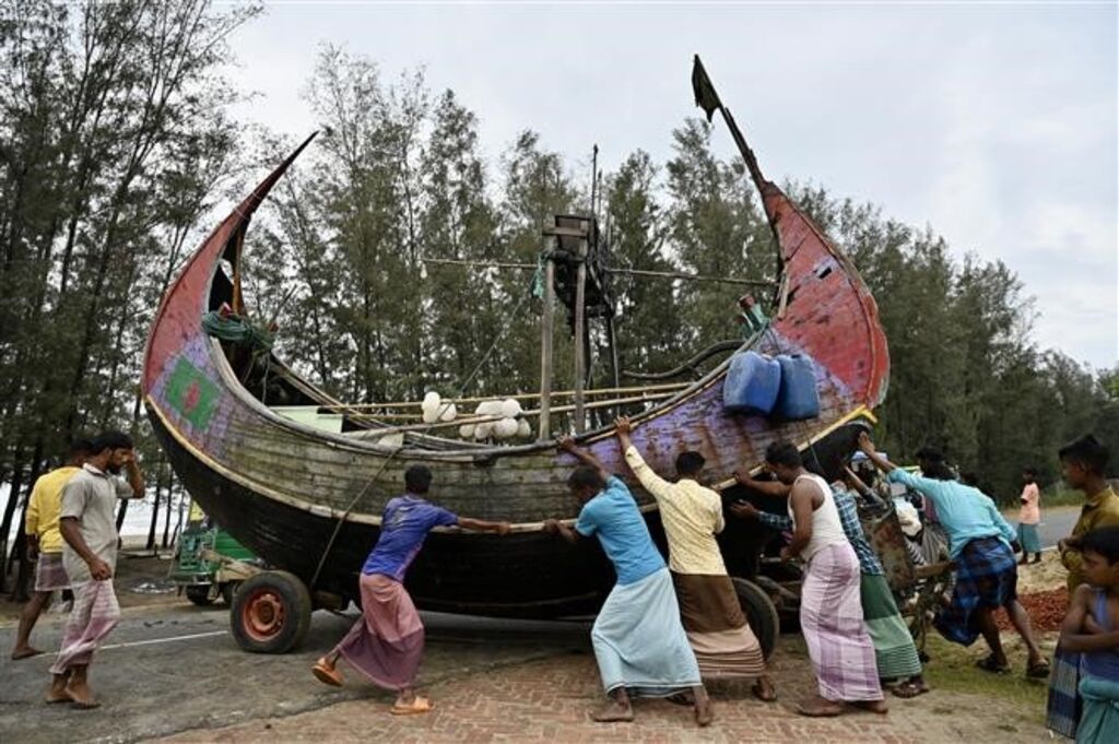 | Des pêcheurs mettent un bateau à l'abri, à l'approche du cyclone Mocha, à Teknaf, au Bangladesh, le 13 mai. |