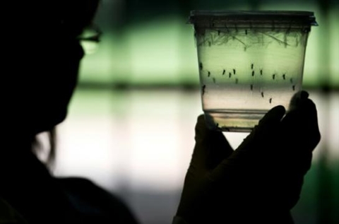 | Un scientifique observe des moustiques Aedes dans un laboratoire de l'université de Sao Paulo, le 8 janvier. |