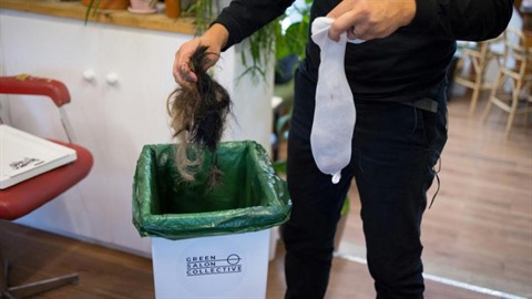 | Le co-fondateur du Green Salon Collective, Fry Taylor, collecte des cheveux pour en faire notamment des filtres dépolluants, dans un salon de coiffure de Londres. |