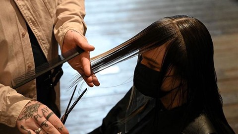 | Adam Reed coupe les cheveux d’une cliente dans son salon de Spitalfields, dans l’est de Londres. |