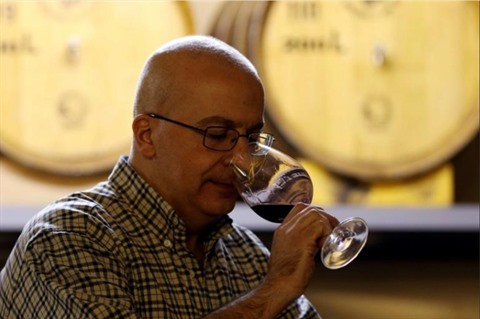 | Omar Zumot, viticulteur jordanien, goûte un vin dans son chai Saint George à Zahab, le 5 novembre 2018 en Jordanie. |