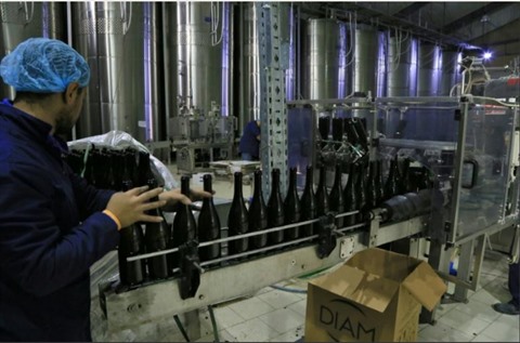 | Un employé vérifie les bouteilles sur une chaîne de production au chai Saint Georges, le 5 novembre 2018 à Zahab, en Jordanie. |