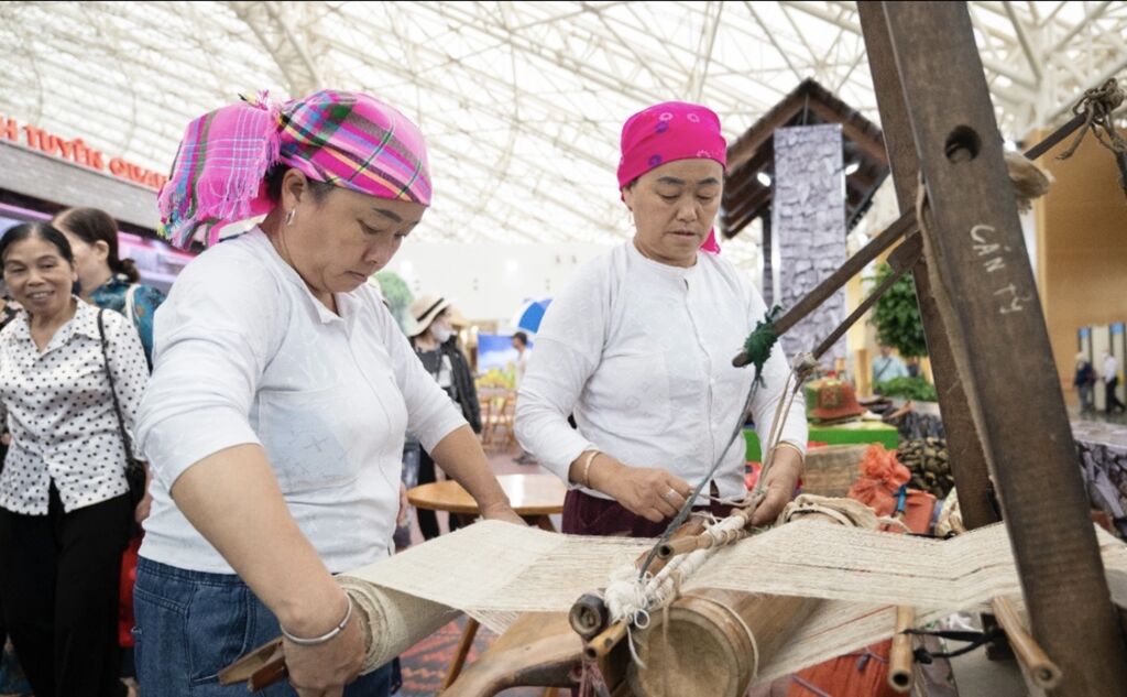 Au stand de Tuyên Quang, les femmes H’mông s’affairent sur leurs métiers à tisser, chaque fil coloré se mêlant aux couleurs de la brocatelle, illustrant la beauté du travail artisanal et la préservation des valeurs culturelles.